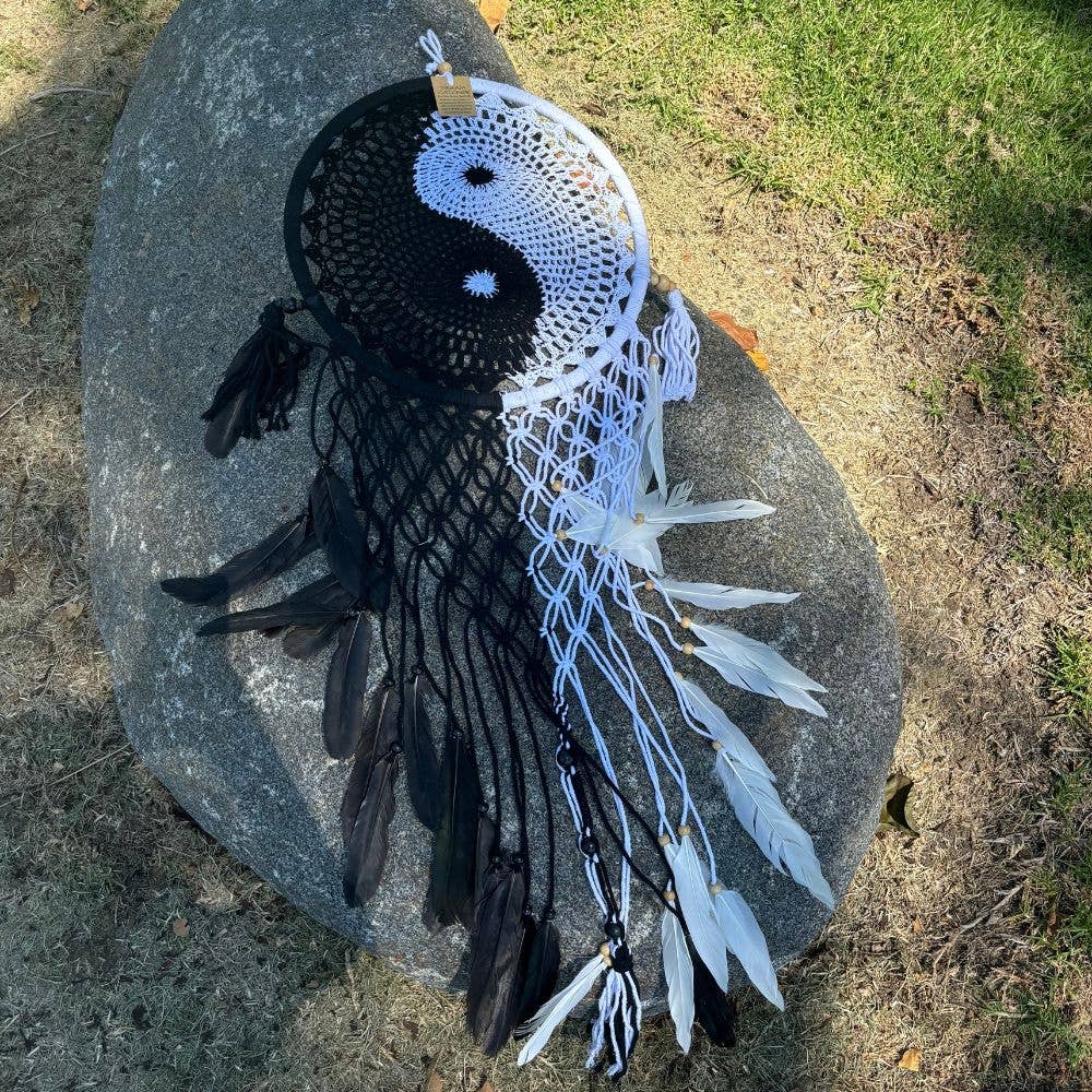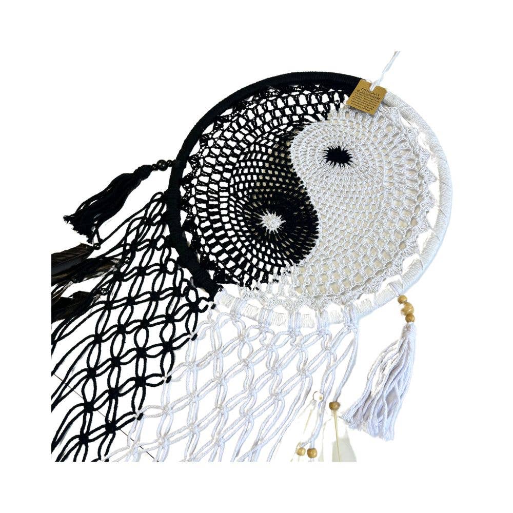 DC-YY Dreamcatcher - Yin Yang Made in Bali 42"L x 14.5"W Min. 1 Elevate your space with our exquisite Large Yin Yang Dreamcatcher, a harmonious blend of traditional Native American and ancient Chinese symbolism. This stunning piece is more than just a decorative item; it’s a powerful symbol of balance and tranquility. In Native American culture, dreamcatchers are believed to filter dreams. Good dreams pass through the web and slide down the feathers to the sleeper below, while bad dreams are trapped in the web and dissipate with the morning light.